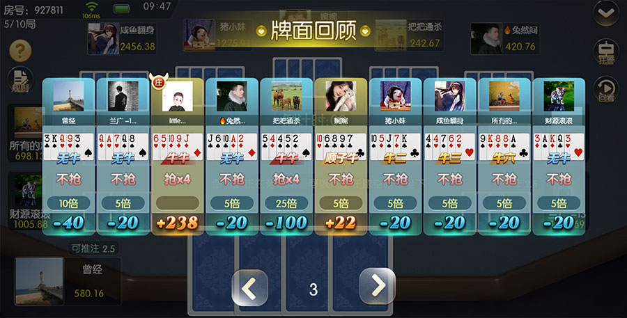 牌型介绍:游戏中的牌型丰富多样,包括“牛牛”、“满天星”、“炸弹”等,每种牌型都有独特的计分方式和胜负规则,这使得游戏更加多变和有趣。具体的牌型设定及大小如下:无牛(5张牌中任意3张牌加起来的数不能成为10的倍数)、有牛(5张牌中任意3张牌加起来的数是10的倍数,另外两张不是10的倍数)、牛牛(5张牌中任意3张牌加起来的数为10的倍数,另外两张加起来的数也为10的倍数)等。
