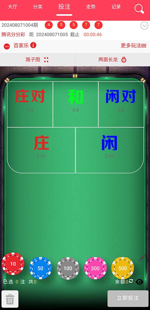 百家乐:第一球及第二球的加总取个位数为庄,第四球及第五球的加总取个位数为闲;庄大于闲,投注庄赢;庄小于闲,投注闲赢;庄等于闲,则投注和赢;如果第一球及第二球号码相同,则投注庄对赢;如果第四球及第五球号码相同,则投注闲对赢;投注庄或闲,开出和局则庄、闲都为输。